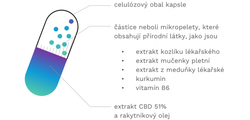 Full-spectrum CBD, rakytníkový olej (obsahuje nenasycené mastné kyseliny, třísloviny, vitaminy a flavonoidy), extrakt z kozlíku lékařského, mučenky pletní a meduňky lékařské, kurkumin, vitamin B6.