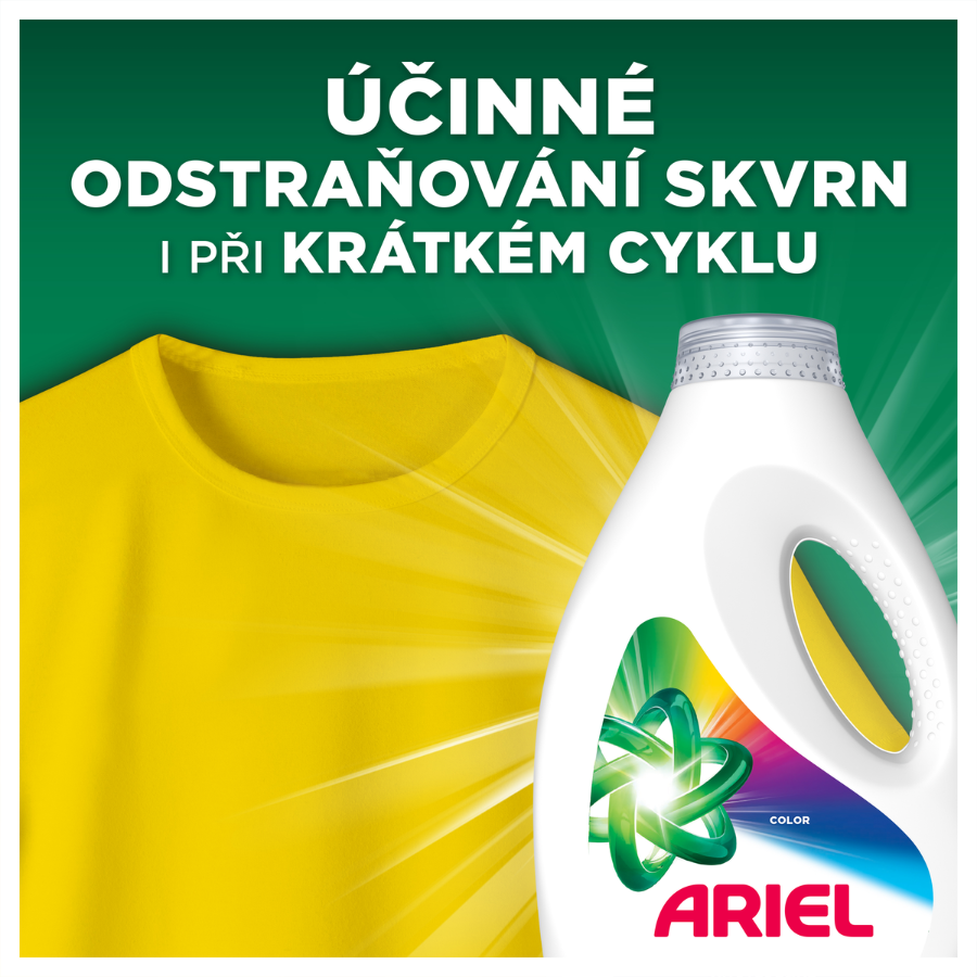 Jeho složení bylo navrženo speciálně pro krátké praní na nízkou teplotu. Tekutý prací prostředek Ariel Color můžete také nanést pomocí zelené odměrky přímo na skvrny, a až poté vložit prádlo do pračky. Aby byly výsledky praní co nejlepší, vložte odměrku naplněnou pracím prostředkem přímo do bubnu pračky. Z důvodu ochrany životního prostředí nemají odměrku všechny lahve.