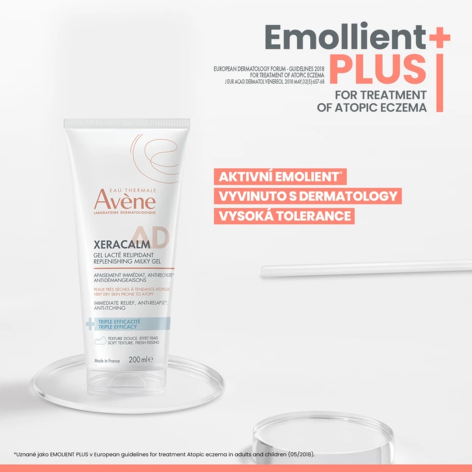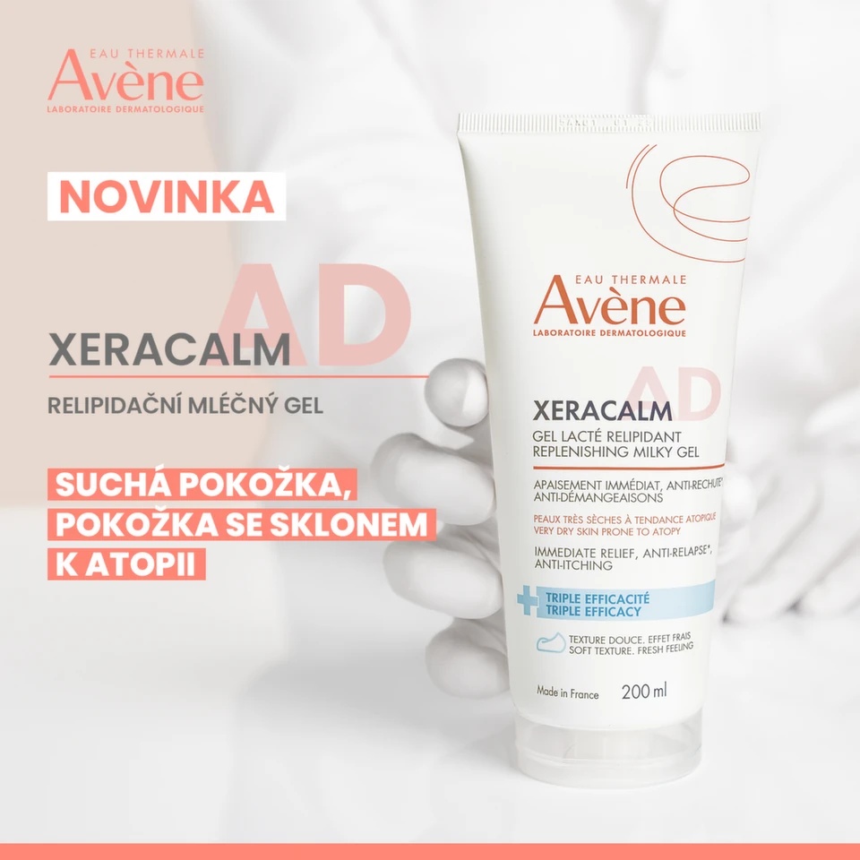 Avène XeraCalm A.D relipidační mléčný gel představuje lehkou alternativu k hutnějším emolienčním přípravkům, ideální pro každodenní péči o suchou, citlivou a atopickou pokožku. Díky své svěží gelové textuře se snadno aplikuje, rychle vstřebává a je vhodný i pro ochlupené části těla, kde bývá aplikace hutnějších krémů méně komfortní.