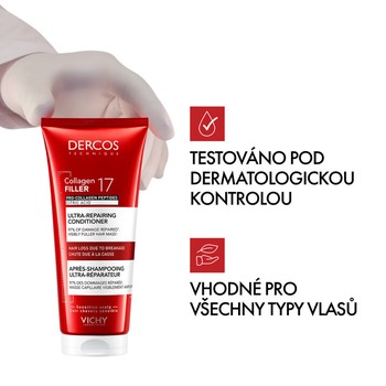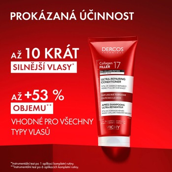 Vichy Dercos Collagen 17 Filler ultra-regenerační kondicionér je závěrečným krokem první ultra-regenerační rutiny značky Vichy, určené pro vlasy oslabené ztrátou kolagenu a zvýšenou lámavostí. Navazuje na účinek kúry a šamponu a cíleně působí na délky a konečky vlasů, kde pomáhá zlepšit jejich odolnost, soudržnost a celkový vzhled.