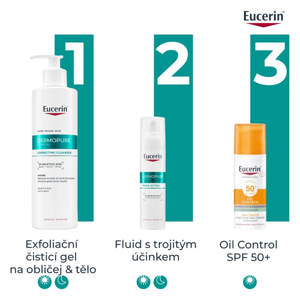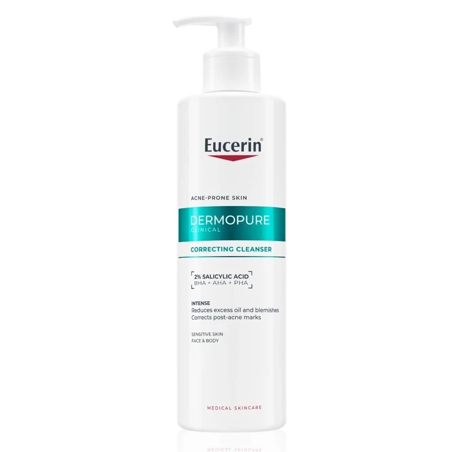 Eucerin DermoPure Clinical Exfoliační čisticí gel je intenzivní přípravek vyvinutý pro problematickou pleť se sklonem k akné. Jeho složení s 2% kyselinou salicylovou (BHA) působí hluboko v pórech, kde rozpouští přebytečný maz a odstraňuje odumřelé kožní buňky. Kombinace AHA a PHA kyselin zajišťuje jemnou exfoliaci povrchu pokožky, zlepšuje její texturu a podporuje přirozenou obnovu.