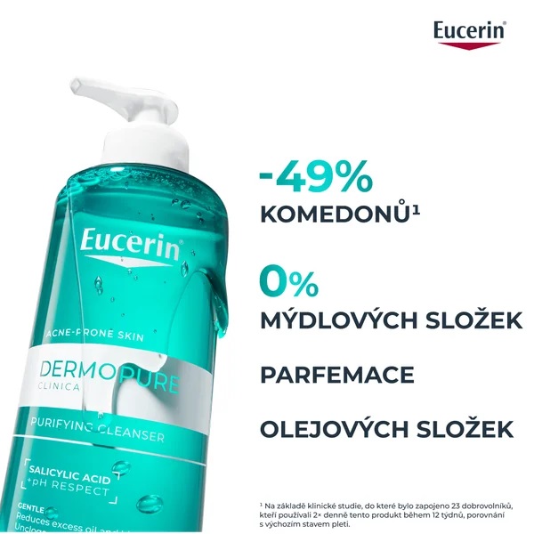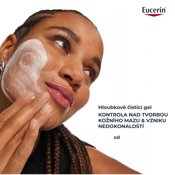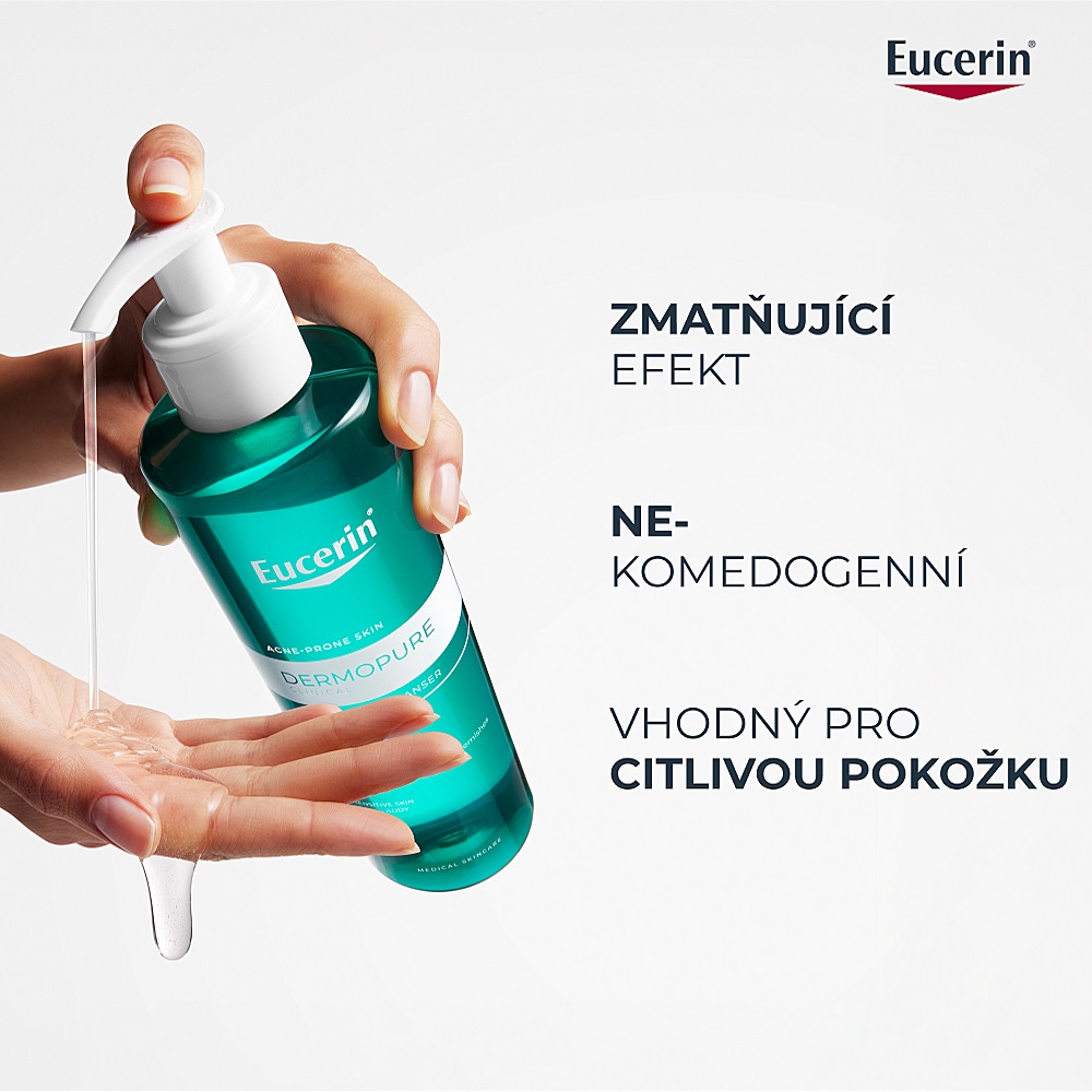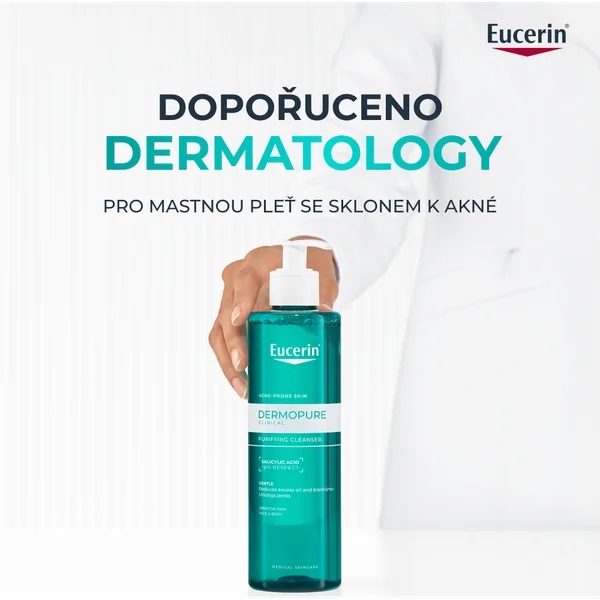 - Čištění: Eucerin DermoPure Clinical hloubkově čisticí gel.