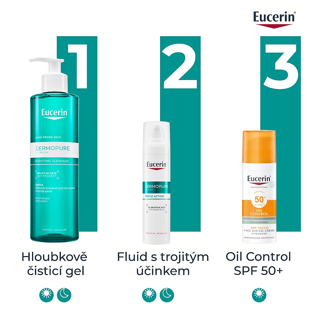 - Péče: Eucerin DermoPure Clinical fluid s trojitým účinkem 40ml.