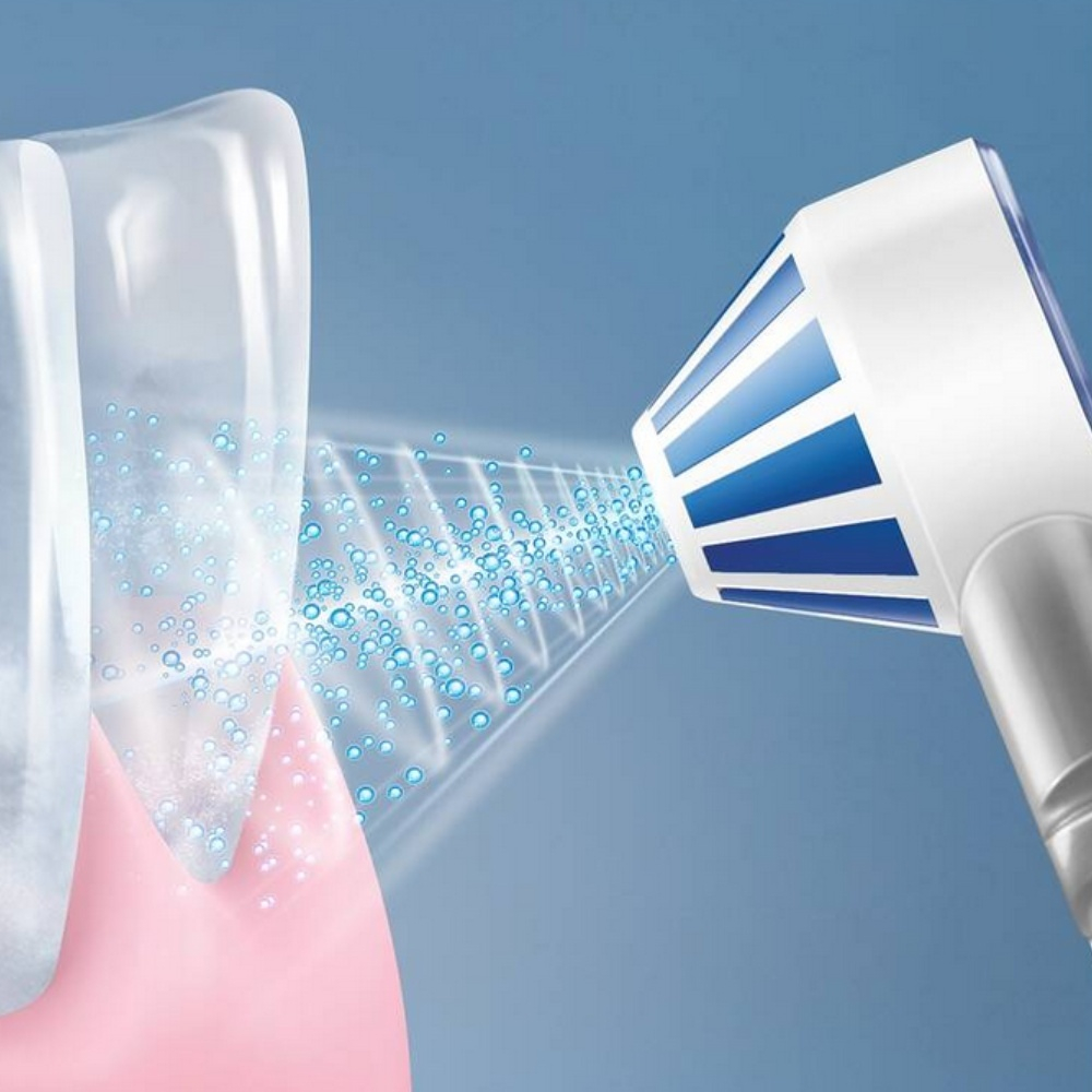 Oxyjet technologie s mikrobublinkami pro účinné, šetrné a bezdrátové čištění mezizubních prostor.