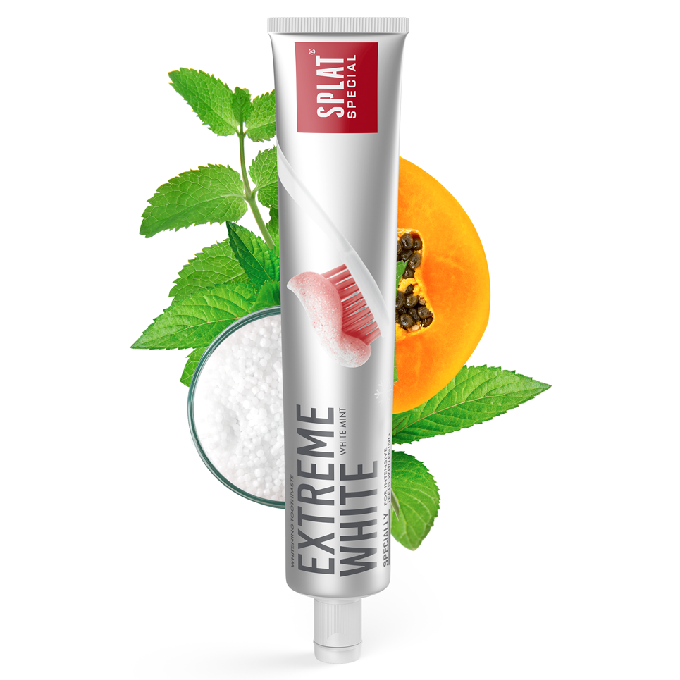 Zubní pasta SPLAT Special EXTREME WHITE s fluoridem poskytuje bělicí účinek viditelný pouhým okem díky inovativním mikrogranulím s karbamid peroxidem, kulatým lešticím částicím a přírodním enzymům. Profesionální metody bělení zubů mohou vyvolat nežádoucí účinky, zatímco používání bělicí zubní pasty je mnohem šetrnější způsob. Zubní pasta EXTREME WHITE obsahuje minimální množství složky karbamid peroxid. Z tohoto důvodu je tato zubní pasta vhodná pro šetrné bělení zubů v domácích podmínkách.