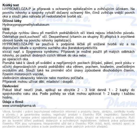l-iYPROMELOZA-P je přípravek s ochranným epitelizačním a zvlhčujícím účinkem. Na povrchu rohovky a spojivky vy...