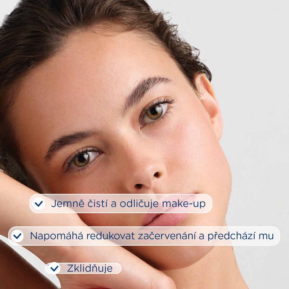 Inovace proti začervenání: čisticí a odličovací micelární voda, která pomáhá redukovat začervenání obličeje.