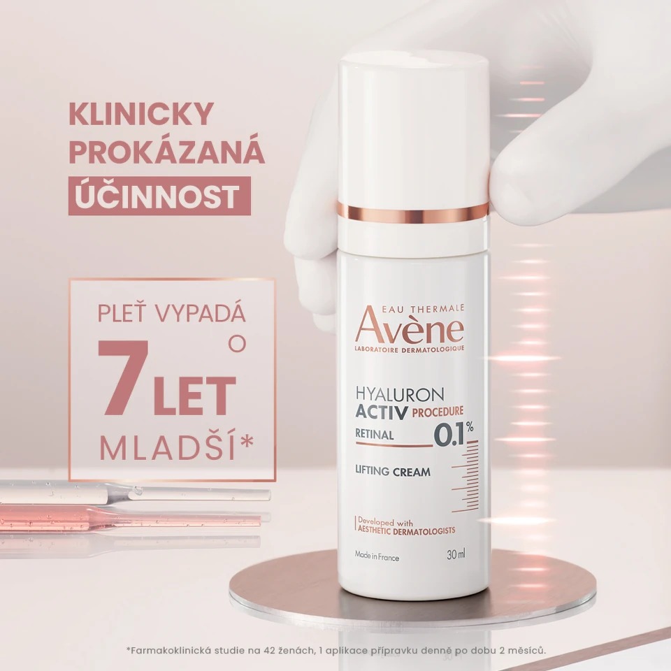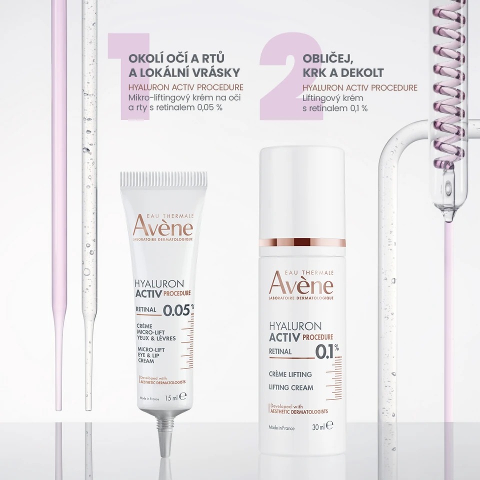 Avène Hyaluron Activ Procedure Liftingový krém představuje pokročilou dermokosmetickou péči vyvinutou společně s estetickými dermatology. Kombinuje tři klíčové aktivní látky uznávané v estetické medicíně: retinal v koncentraci 0,1 %, fragmenty kyseliny hyaluronové a niacinamid. Toto vysoce funkční složení podporuje vyhlazení vrásek, zlepšení elasticity a celkovou revitalizaci pleti.