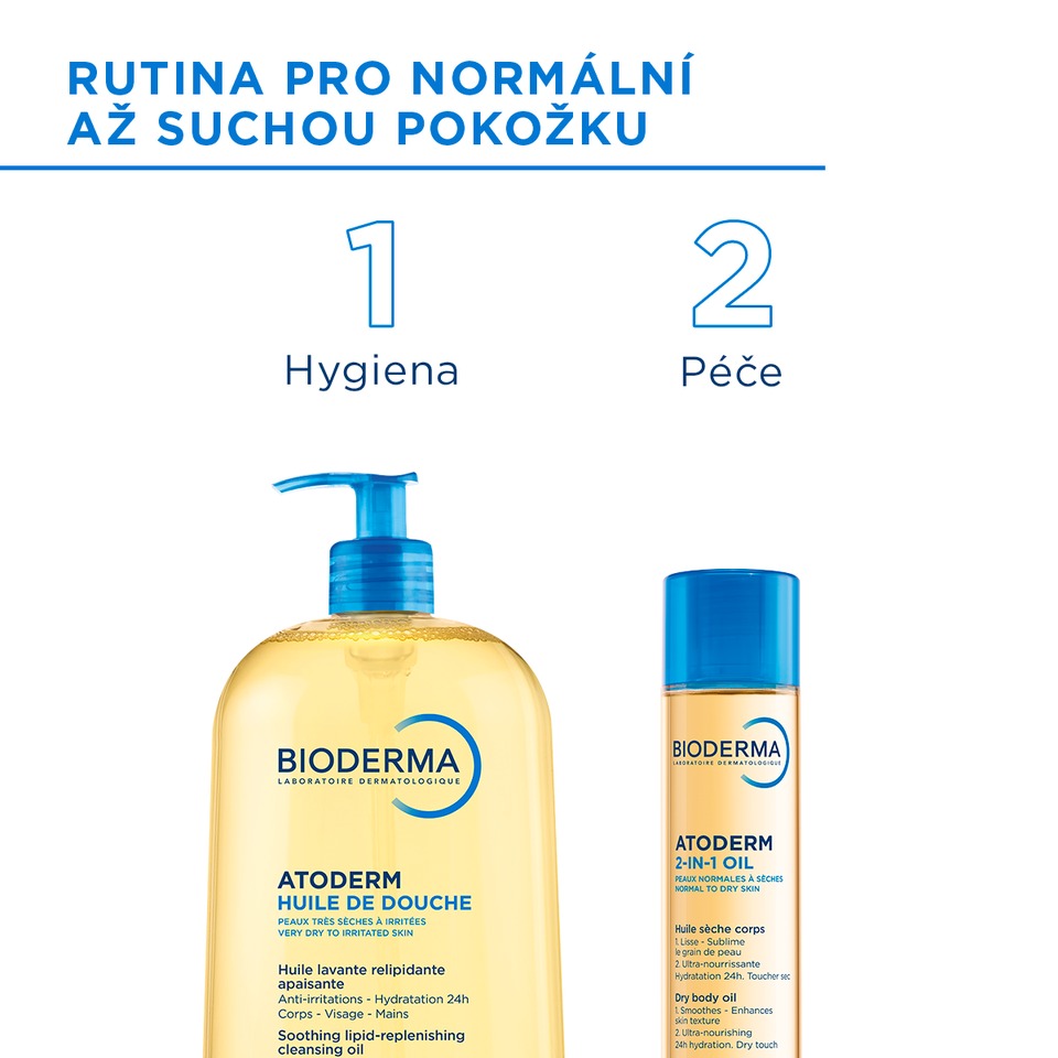 ATODERM OLEJ 2v1 byl vyvinut s ohledem na specifické potřeby suché pokožky. Odstraňuje přebytečné odumřelé buňky a zároveň respektuje fyziologické pH pokožky pro optimální toleranci kožního ekosystému. Jeho biomimetické lipidy (ceramidy, skvalen a rostlinné oleje s obsahem mastných kyselin) jsou přirozeně rozpoznávány pokožkou a pomáhají posilovat hydrolipidický film a mezibuněčný cement. Intenzivně zjemněná a vyživená pokožka sama znovu získává přirozenou a dlouhodobou hydrataci.