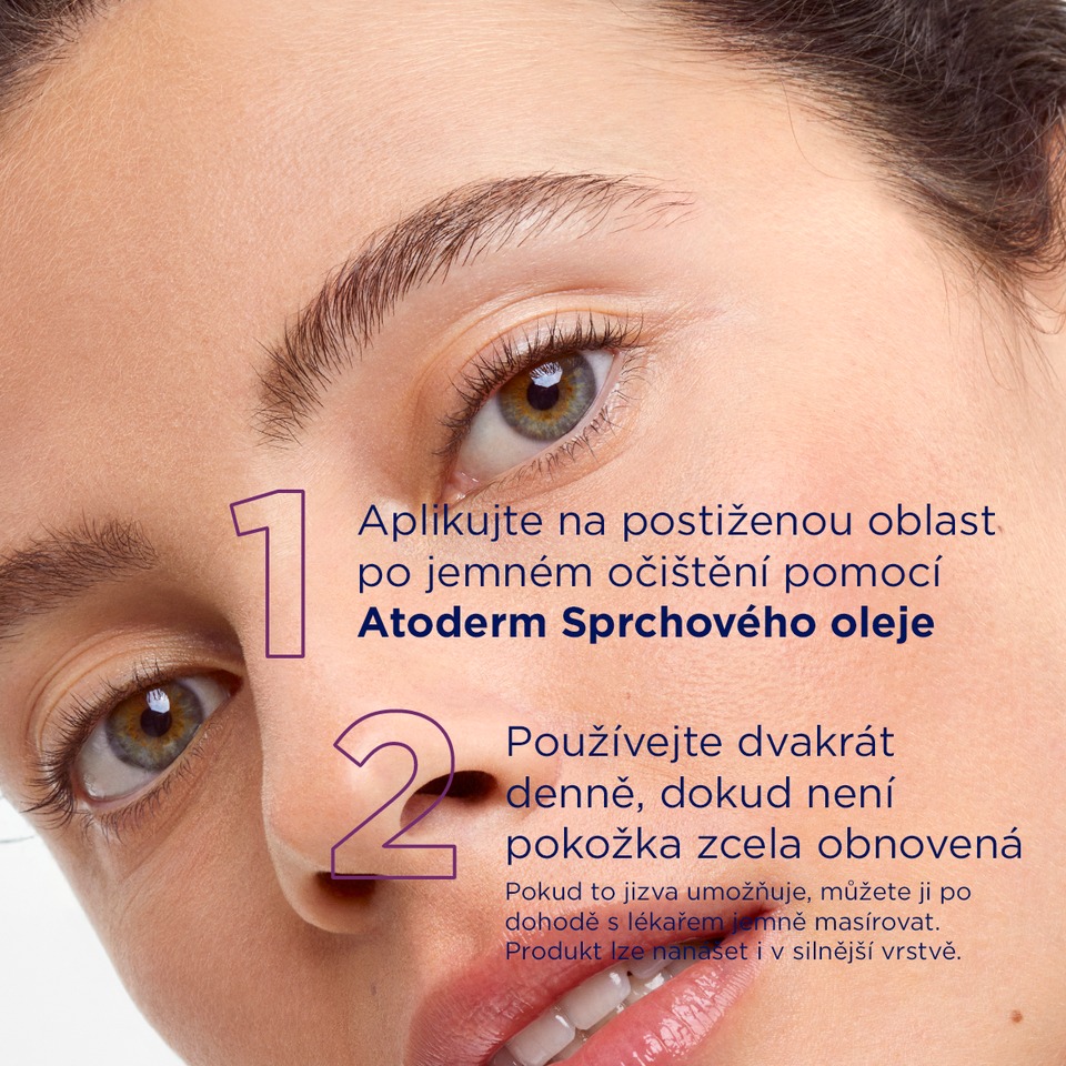 Aplikujte na poškozenou oblast po jemném očištění pomocí produktu Atoderm Sprchový olej. Používejte dvakrát denně až do úplného zahojení pokožky. Lze nanášet v silné vrstvě. Neaplikujte na otevřené rány nebo mokvající kůži. Pokud podráždění pokožky přetrvává, poraďte se s lékařem. V případě vystavení slunci použijte na zbytek těla ochranný prostředek proti slunci. Není určeno pro předčasně narozené děti.