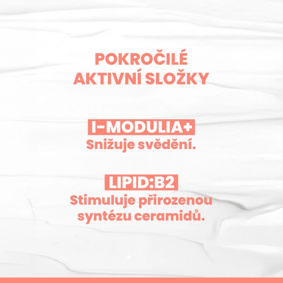 Obsahuje patentovanou látku I-Modulia, která se zaměřuje na pocity svědění spojené se suchostí pokožky, a komplex Lipid:B2 podporující tvorbu ceramidů. Kombinace aktivních složek pomáhá posilovat přirozenou obranyschopnost pokožky a zlepšovat její odolnost vůči vnějším vlivům. Díky sterilní technologii balení je přípravek vhodný i pro velmi citlivou nebo oslabenou pokožku, včetně pokožky při dermatologické či onkologické léčbě.