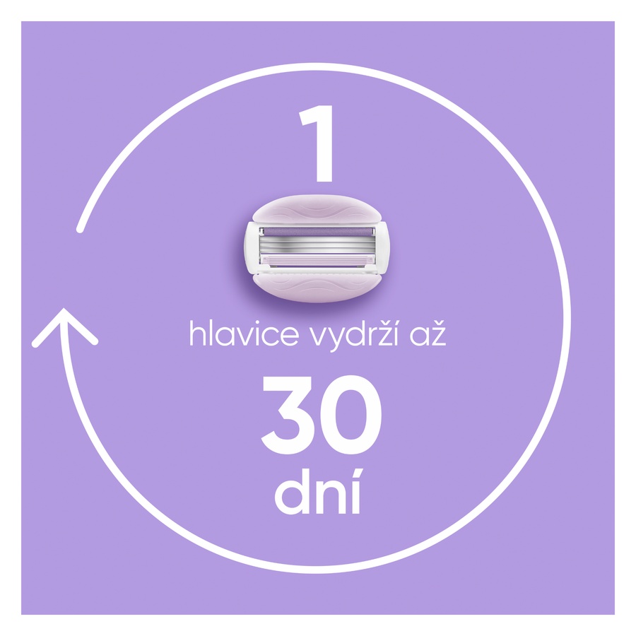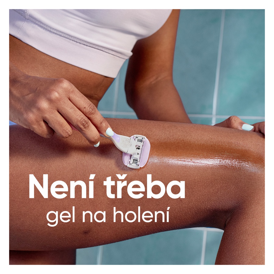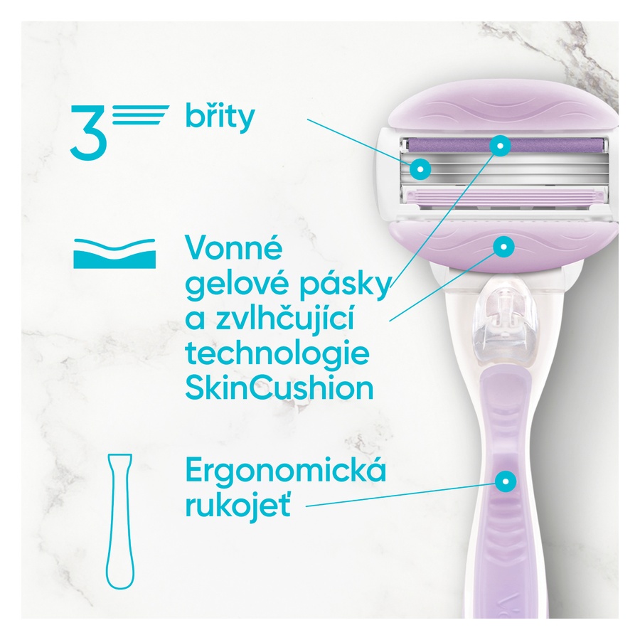 3 břity s gelovými pásky a tělovými másly zajistí hladké a komfortní oholení s jemnou vůní frézie.