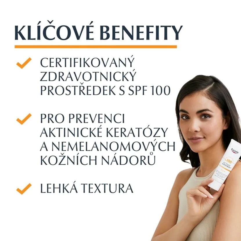 Eucerin Sun Actinic Control MD SPF 100 je zdravotnický prostředek určený k prevenci aktinické keratózy a nemelanomových kožních nádorů, zároveň je vhodný jako podpůrná přídatná léčba při již vzniklé aktinické keratóze. Díky vysokému ochrannému faktoru SPF 100 účinně blokuje až 99 % UVB záření, které je hlavním původcem poškození buněk a vzniku předrakovinných změn na kůži.