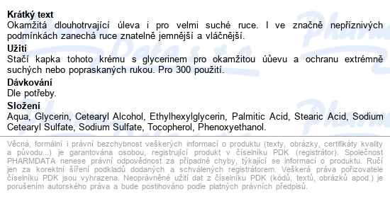 Okamžitá dlouhotrvající úleva i pro velmi suché ruce. I ve značně nepříznivých podmínkách zanechá ruce znatelně jemnější a vláčnější.
