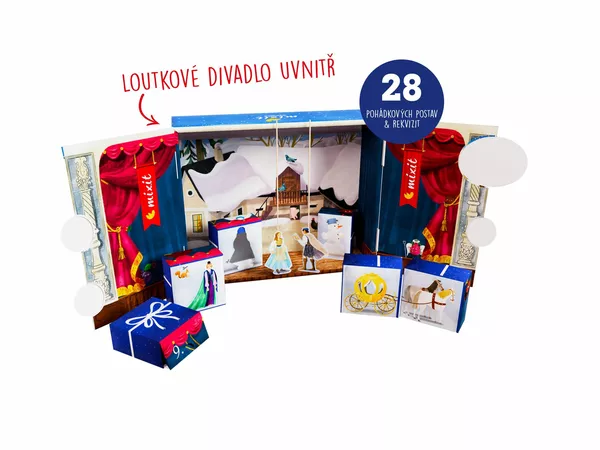 - Celý kalendář je zároveň obřím loutkovým divadlem! Přidáme vám k němu divadelní kulisy a pohádkové postavičky. Krabičky po otočení vytvoří originální mozaiku a můžete je použít i jako krásný obal na dárky.