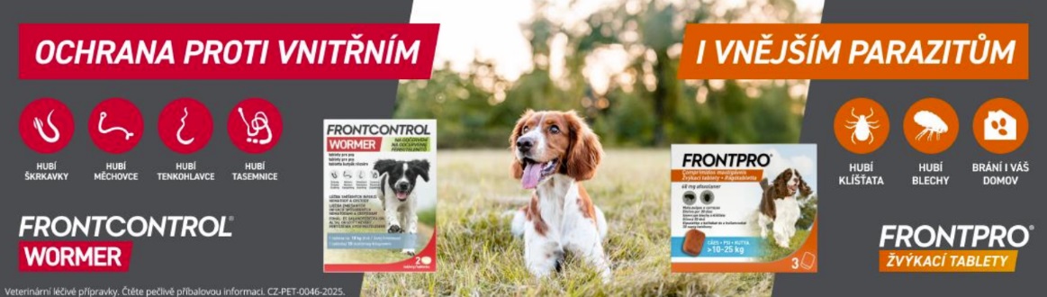 - Frontpro 68mg 10-25kg 3 žvýkací tablety + Frontcontrol Wormer pro psy 2 tablety