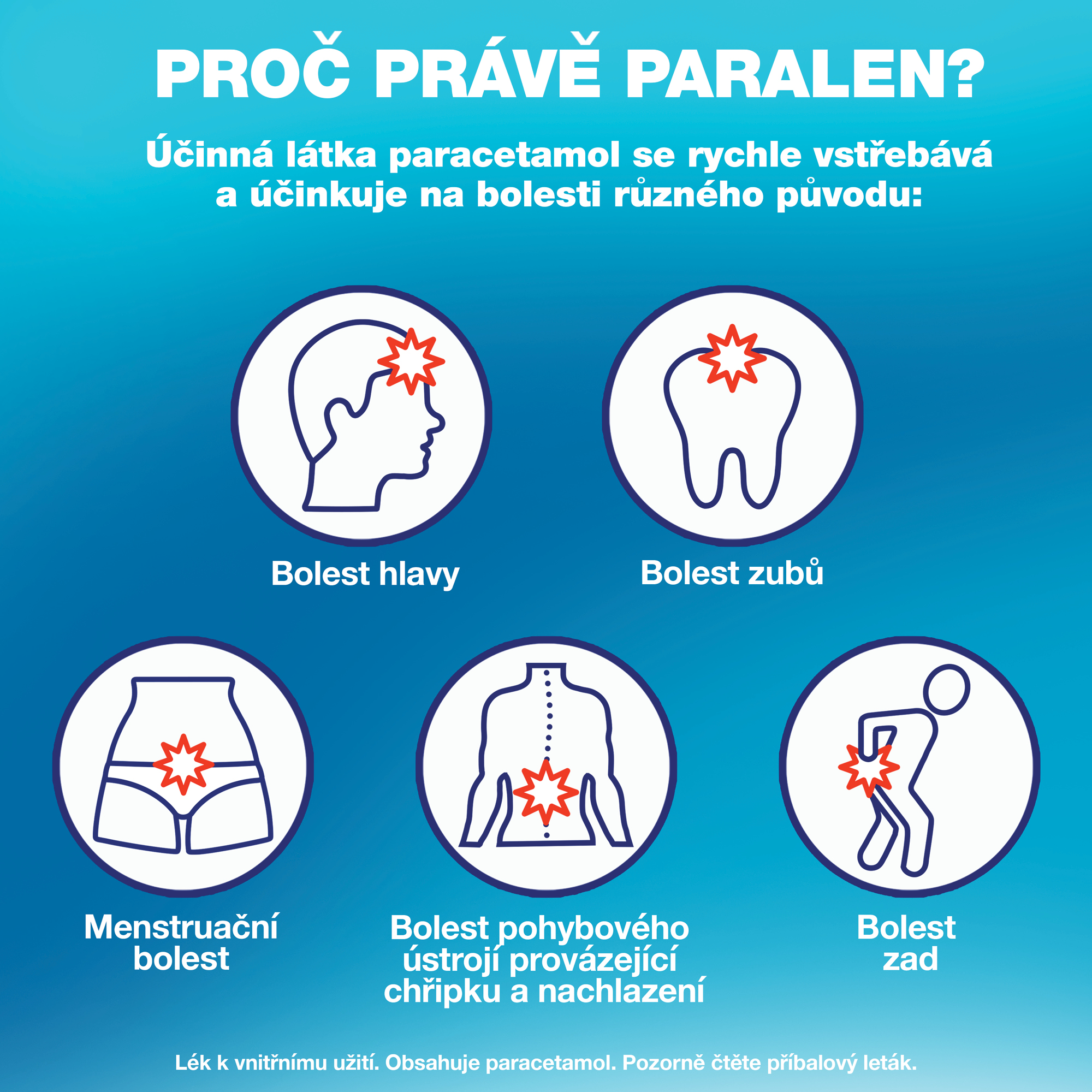 Tablety PARALEN 500 mg jsou určeny ke snížení horečky při chřipce, nachlazení a jiných infekčních onemocněních. Přípravek je také vhodný při bolestech různého původu, např. při bolestech hlavy, zubů, bolestivé menstruaci, bolesti zad a bolesti pohybového ústrojí provázející chřipku a nachlazení.
