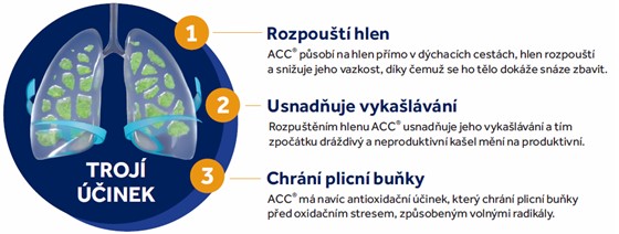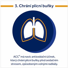 Acetylcystein obsažený v přípravcích ACC® díky svému dvojitému antioxidačnímu účinku působí proti volným radikálům na dvou úrovních. Jednak přímo neutralizuje volné radikály. A zároveň při své metabolizaci poskytuje jeden za základních kamenů pro vznik glutathionu, jednoho z nejsilnějších antioxidantů v organismu, a tím přispívá ke snížení oxidačního stresu a ochraně plicních buněk.