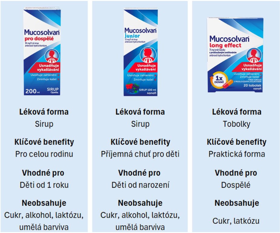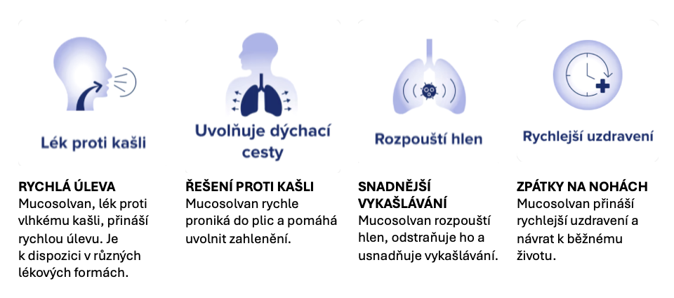 Akutní onemocnění jsou na počátku obvykle doprovázena suchým dráždivým kašlem, případně ještě pocitem pálení na hrudi u zánětu průdušek a chrapotem u zánětu hrtanu. V dalším průběhu dochází k tvorbě vazkého hlenu a postupnému vykašlávání. U chronických stavů mohou být oba druhy kašle - suchý dráždivý kašel i vlhký typ kašle s vykašláváním hlenu. Ambroxol-hydochlorid, léčivá látka přípravku Mucosolvan pro dospělé, zvyšuje v dýchacích cestách sekreci hlenu, tvorbu plicního surfaktantu (látka pokrývající vnitřní stěny plicních sklípků) a stimuluje činnost řasinek zajišťující transport hlenu. Tyto účinky mají za následek vydatnější zkapalnění, lepší transport a vylučování hlenu (mukociliární clearance), čímž dochází k usnadnění vykašlávání a zmírnění kašle.