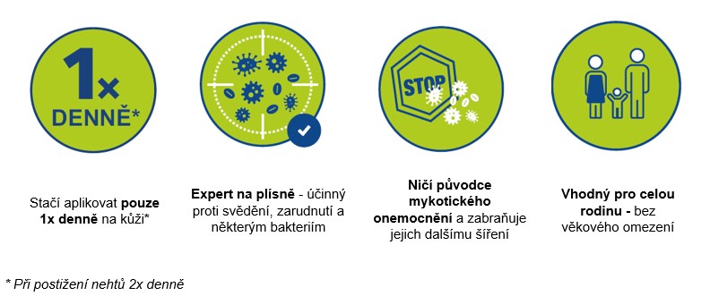 Rychlá úleva od svědění a zarudnutí, účinná ochrana pokožky před plísní.