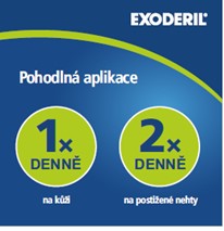Stačí aplikovat pouze 1x denně na kůži a 2x denně na postižené nehty. Exoderil® kožní roztok se díky lahvičce s kapátkem snadno aplikuje i na hůře dostupná místa, především na postižené nehty, neboť se dobře nanáší na nehtovou ploténku a její okolí.