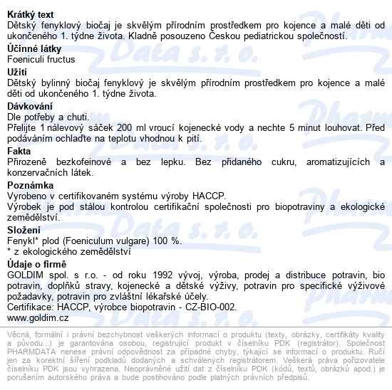 Dětský fenyklový biočaj je skvělým přírodním prostředkem pro kojence a malé děti od ukončeného 1. týdne života. Kladně posouzeno Českou pediatrickou společností.