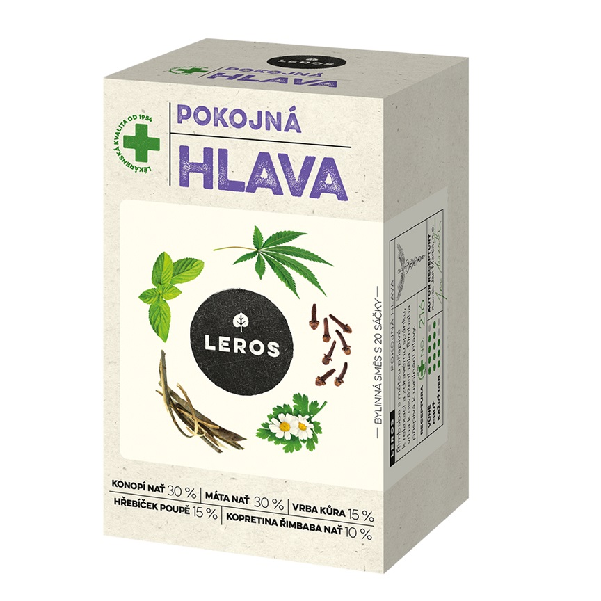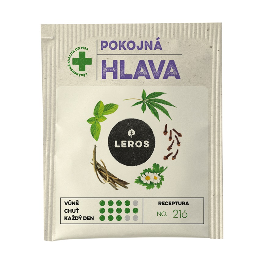 LEROS Pokojná hlava je bylinná směs určená k relaxaci a podpoře psychické pohody. Pomáhá mírnit nepříjemné pocity spojené s hlavou, přináší zklidnění bez uspávajícího účinku a podporuje celkový pocit rovnováhy.