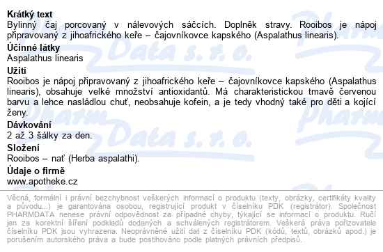 Bylinný čaj porcovaný v nálevových sáčcích. Doplněk stravy. Rooibos je nápoj připravovaný z jihoafrického keře...