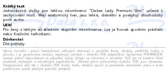 Jednorázové vložky pro lehkou inkontinenci "Dailee Lady Premium Slim" určené k zachycování moči. Mají anatomický tvar, jsou lehké, diskrétní a poskytují dlouhodobý pocit sucha.