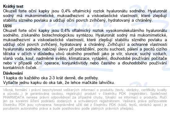 Okuzell forte oční kapky jsou 0,4% oftalmický roztok hyaluronátu sodného. Hyaluronát sodný má mukomimetické, mukoadhezivní a viskoelastické vlastnosti, které zlepšují stabilitu slzného povlaku a udržují oční povrch zvlhčený, hydratovaný a chráněný.