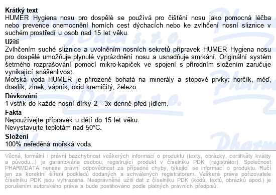 HUMER Hygiena nosu pro dospělé se používá pro čištění nosu jako pomocná léčba nebo prevence onemocnění horních cest dýchacích nebo ke zvlhčení nosní sliznice v suchém prostředí u osob nad 15 let věku.